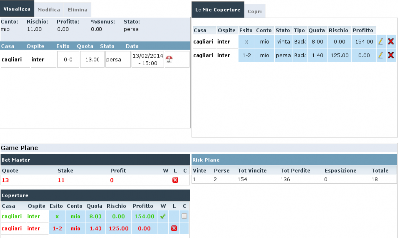 Dalle immagini vediamo sia il profitto che il rischio delle nostre puntate. Al momento non salviamo la copertura perchè vogliamo fare delle prove e vedere quanto vinceremmo in caso di esito 0-0 oppure 1 o 2. Se la partita terminerà 0-0 porteremo a casa un profitto di 7 unità, se terminerà 1 o 2 vinceremo invece 39 unità. Ovviamente questi dati saranno elaborati istantaneamente dal sistema ogni volta che assegneremo un valore vinta o persa alla schedina principale (Win/Loss) e alla copertura (vinta/persa) e ogni qual volta assegneremo un nuovo valore al campo rischio e quota.